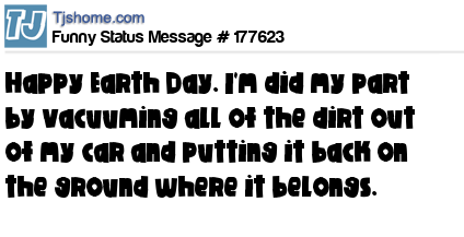 X Happy Earth Day. I'm did my part by vacuuming all of the dirt out of my car and putting it back on the ground where it belongs.