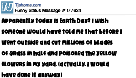 X says Apparently today is Earth Day? I wish someone would have told me that before I went outside and cut millions of blades of grass in half and poisoned the yellow flowers in my yard. (actually, I would have done it anyway)