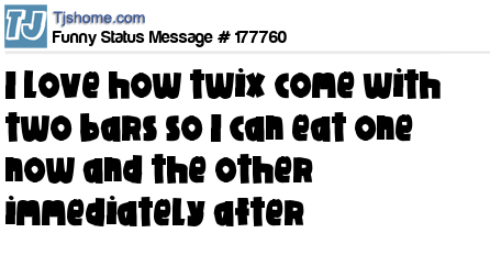 X says I love how twix come with two bars so I can eat one now and the other immediately after