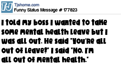 - # 177907 I told my boss I wanted to take a day of mental health leave but I was all out. She said "You're all out of leave?" I said "No, I'm all out of mental health."