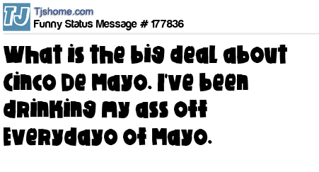 X says What is the big deal about Cinco De Mayo. I've been drinking my ass off Everydayo of Mayo.