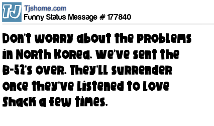 - # 127361 Don't worry about the problems in North Korea, besides the destroyer......we've sent the B52's over. They'll surrender once they've listened to Love Shack a few times.