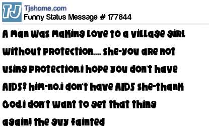X says a man was making love to a village girl without protection.... she-you are not using protection,i hope you don't have AIDS? him-no,i don't have AIDS she-thank God,i don't want to get that thing again! the guy fainted