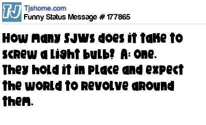 X says How many SJWs does it take to screw a light bulb? A: One. They hold it in place and expect the world to revolve around them.