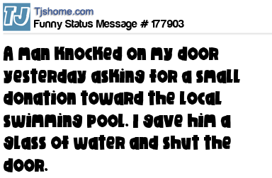 - # 109312 A man came to my door and asked if I would make a donation to the local swimming pool. So I gave him a glass of water.
