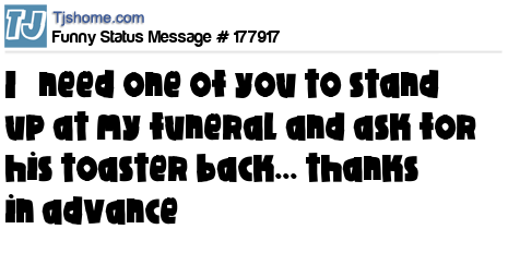 X says I need one of you to stand up at my funeral and ask for his toaster back... thanks in advance