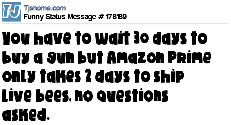 X says You have to wait 30 days to buy a gun but Amazon Prime only takes 2 days to ship live bees, no questions asked.