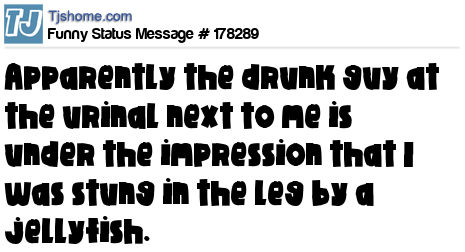 X says Apparently the drunk guy at the urinal next to me is under the impression that I was stung in the leg by a jellyfish.