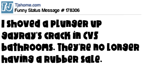 X says I shoved a plunger up gayray's crack in CVS bathrooms. They're no longer having a rubber sale.