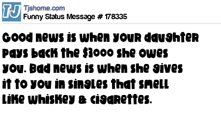 X says Good news is when your daughter pays back the $3000 she owes you. Bad news is when she gives it to you in singles that smell like whiskey & cigarettes.