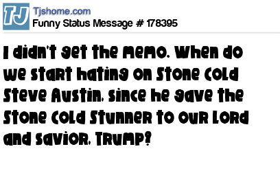 X is I didn't get the memo. When do we start hating on Stone Cold Steve Austin, since he gave the Stone Cold Stunner to our lord and savior, Trump?