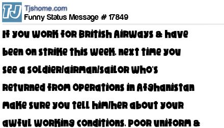 X If you work for British Airways & have been on strike this week, next time you see a soldier/airman/sailor who's returned from Operations in Afghanistan make sure you tell him/her about your awful working conditions, poor uniform & low pay. Good luck.