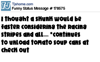 X says I thought a skunk would be faster considering the racing stripes and all.... *continues to unload tomato soup cans at check out
