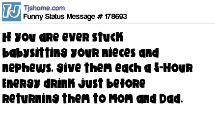 - # 154348 If you ever get stuck babysitting your nieces and nephews, be sure to give them each a 5-Hour Energy Drink before you give them back to Mom and Dad.