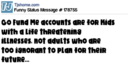 X Go Fund Me accounts are for kids with a life threatening illnesses, not adults who are too ignorant to plan for their future...