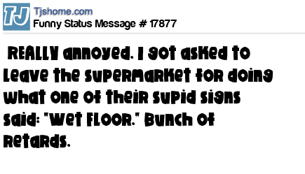 X   REALLY annoyed. I got asked to leave the supermarket for doing what one of their supid signs said: "Wet Floor." Bunch of retards.