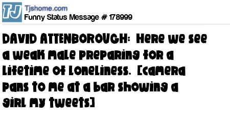 X says DAVID ATTENBOROUGH: Here we see a weak male preparing for a lifetime of loneliness. [camera pans to me at a bar showing a girl my tweets]