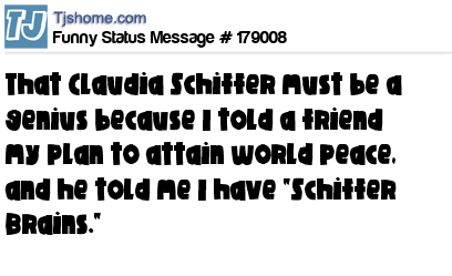 X says That Claudia Schiffer must be a genius because I told a friend my plan to attain world peace, and he told me I have "Schiffer Brains."