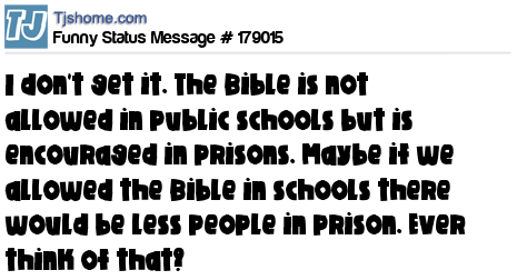 - # 24278 Kids can't read the Bible in school, but are encouraged to read it in prison. Maybe if we allowed them to read it in school, they might never end up in prison.