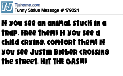 X says If you see an animal stuck in a trap, free them! If you see a child crying, comfort them! If you see Justin Bieber crossing the street, HIT THE GAS!!!