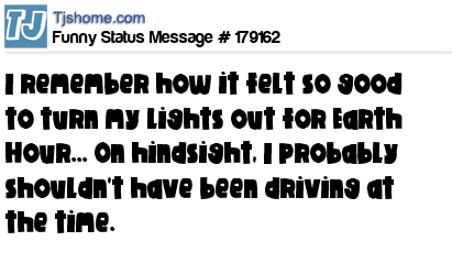 X says I remember how it felt so good to turn my lights out for Earth Hour... On hindsight, I probably shouldn't have been driving at the time.
