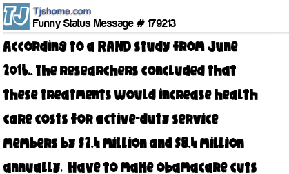 X says According to a RAND study from June 2016,. The researchers concluded that these treatments would increase health care costs for active-duty service members by $2.4 million and $8.4 million annually, Have to make obamacare cuts somewhere.