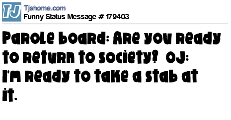 X is Parole board: Are you ready to return to society? OJ: I'm ready to take a stab at it.