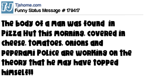 - # 4027 shocked to hear of the discovery of the body of the local pizza man covered in cheese and pepperoni....police believe he topped himself