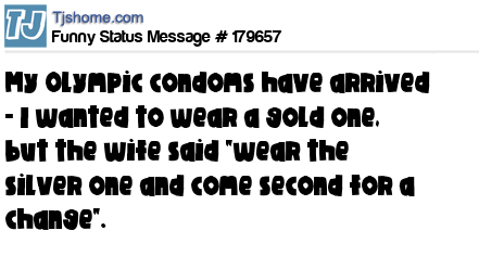 - # 87082 Husband:"My Olympic condoms are here, I think I'll wear the gold one 2night" Wife:"Couldnt you wear the silver one and come 2ND 4 a change"
