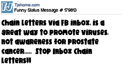 X says Chain letters via FB inbox, is a great way to promote viruses, not awareness for prostate cancer..... Stop Inbox Chain letters!!