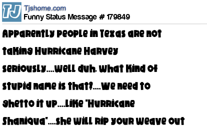 X is Apparently people in Texas are not taking Hurricane Harvey seriously....well duh, what kind of stupid name is that?....We need to ghetto it up....like "Hurricane Shaniqua"....she will rip your weave out just for looking at her.