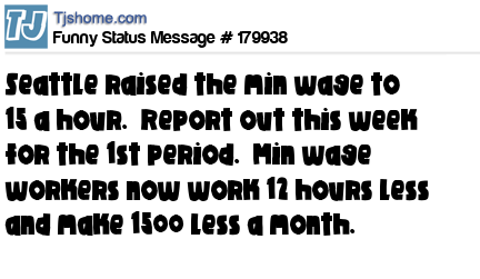 X says Seattle raised the min wage to 15 a hour. Report out this week for the 1st period. Min wage workers now work 12 hours less and make 1500 less a month.