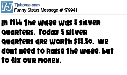 X says in 1964 the wage was 5 silver quarters. Today 5 silver quarters are worth $15.50. We dont need to raise the wage, but to fix our money.