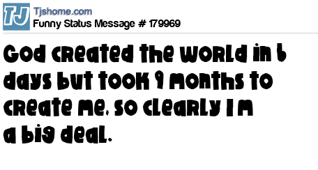 - # 183734 God created the world in 7 days, but took 9 months to create me. So clearly I'm a big deal