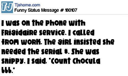 X says I was on the phone with Frigidaire service. I called from work. The girl insisted she needed the serial #. She was snippy. I said, "Count Chocula 666."