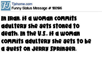 X says In Iran, if a woman commits adultery she gets stoned to death. In the U.S., if a woman commits adultery she gets to be a guest on Jerry Springer.