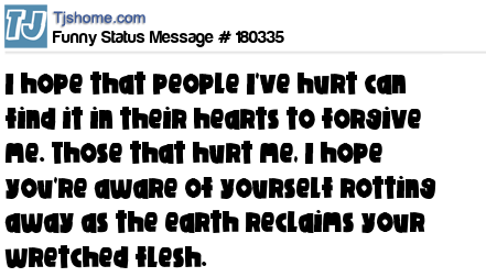X is I hope that people I've hurt can find it in their hearts to forgive me. Those that hurt me, I hope you're aware of yourself rotting away as the earth reclaims your wretched flesh.