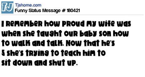 X is I remember how proud my wife was when she taught our baby son how to walk and talk. Now that he's 5 she's trying to teach him to sit down and shut up.