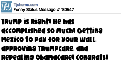 X is Trump is right! He has accomplished so much! Getting Mexico to pay for your wall, approving TrumpCare, and repealing ObamaCare! Congrats!