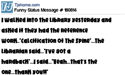 X is I walked into the library yesterday and asked if they had the reference work.."Calcification Of The Spine"...The librarian said..."I've got a hardback"...I said..."Yeah...that's the one...thank you!!"