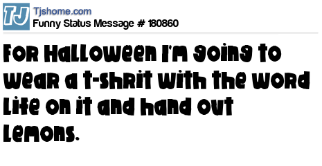- # 77054 For Halloween I'm going to write "Life" on a plain white T-shirt and hand out lemons to strangers