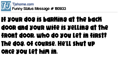 - # 22687 My dog was barking at the back door and my wife was yelling at the front door. I always let the dog in first because at least its shuts up when it gets in the house.