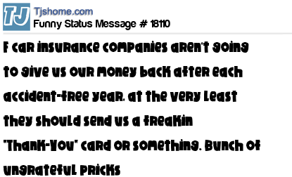 X f car insurance companies aren't going to give us our money back after each accident-free year, at the very least they should send us a freakin "Thank-You" card or something. Bunch of ungrateful pricks