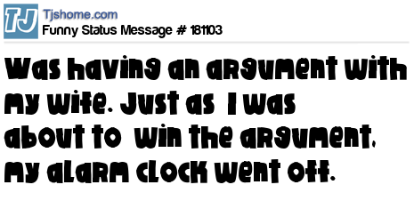 X is Was having an argument with my wife. Just as I was about to win the argument, my alarm clock went off.