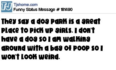X says They say a dog park is a great place to pick up girls. I don't have a dog so I am walking around with a bag of poop so I won't look weird.