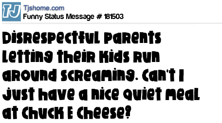X Disrespectful parents letting their kids run around screaming. Can't I just have a nice quiet meal at Chuck E Cheese?