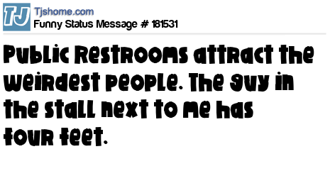 - # 153840 Public restrooms are weird. The guy in the stall next to me has four feet and is wearing heels on one pair.