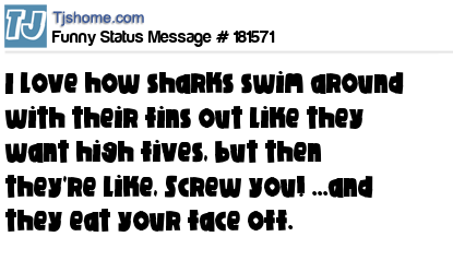 X says I love how sharks swim around with their fins out like they want high fives, but then they're like, Screw you! ...and they eat your face off.