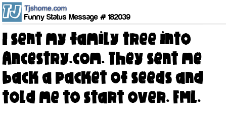 - # 188165 I answered that Ancestry.com ad and asked for some information on my family tree. They sent me back a packet of seeds and suggested that I just start over. FML.