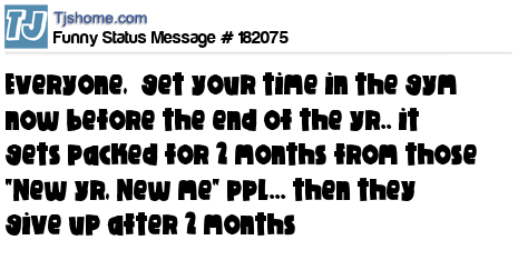 X says Everyone, get your time in the gym now before the end of the yr.. it gets packed for 2 months from those "New yr, New me" ppl... then they give up after 2 months